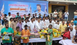 தளபதி அவர்களின் 31-வது ஆண்டு திரையுலக கலைபயணத்தை முன்னிட்டு. திருச்சிற்றம்பலம் கூட்ரோடு பகுதியில் தூய்மை பணியாளர்கள் 30 நபர்களுக்கு ரெயின் கோட், புடவை மற்றும் 5கிலோ அரிசி பைகளும், பெண்கள் 350 வழங்கினார்.