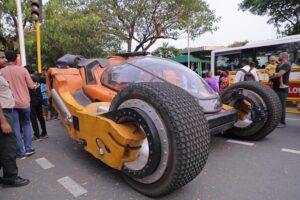கற்பனையிலும் நினைத்து பார்த்திராத வடிவத்தில், மூன்று சக்கரங்களுடன், நவீன வசதிகளுடன், பார்த்தவுடன் எதிர்காலத்தை கண்முன் கொண்டு வரும் வகையிலான புஜ்ஜி வாகனம், பார்த்தவர்கள் அனைவரையும் வியப்பில் ஆழ்த்தியது.